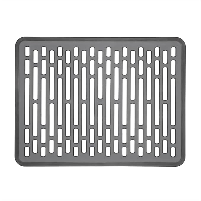 The OXO Good Grips Large Sink Mat provides a soft cushion to protect dishware and sink surfaces from scratches, chips and dents. The rigid, raised design allows drainage and airflow to promote quicker drying. Non-slip feet elevate the Mat while keeping it in place. Our Sink Mat is PVC-free and easy to clean. 12. 25 in x 16 in x 0. 5 in/31 cm x 40. 6 cm x 1. 3 cm