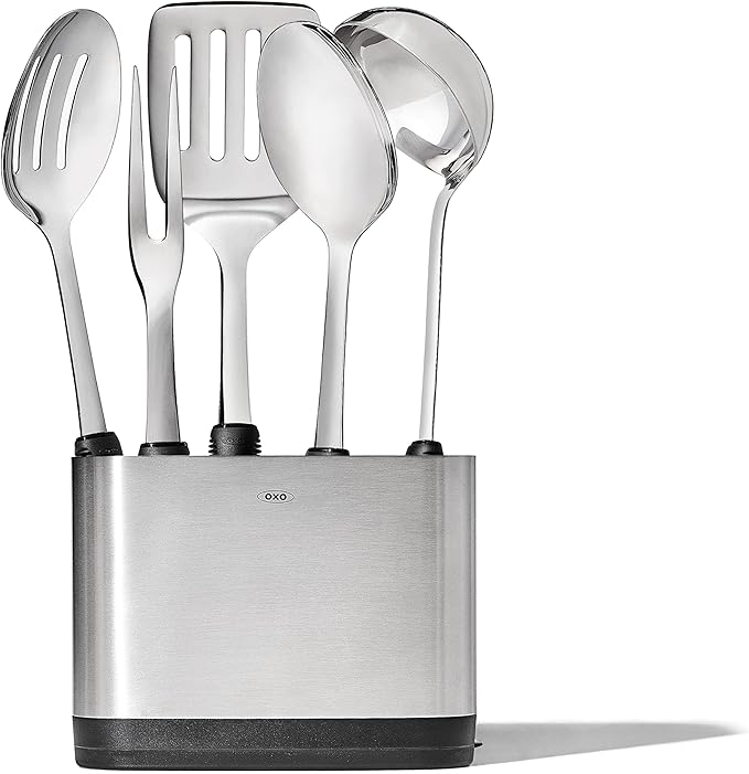 Perfect for wedding registries, housewarming gifts or kitchen upgrades, the OXO Good Grips 6-Piece Prep & Serve Set transitions seamlessly from kitchen to table. The elegant stainless steel construction is built to last, and each tool in the six-piece set is designed with comfort in mind. The Utensil Holder provides a neat spot for storing the tools, holding them upright for easy access. Whether you’re cooking a simple weeknight stew or your signature Sunday roast, you can serve in style. Set includes Stainless Steel Turner, Stainless Steel Spoon, Stainless Steel Slotted Spoon, Stainless Steel Ladle, Stainless Steel Fork, Stainless Steel Utensil Holder. Dishwasher safe.